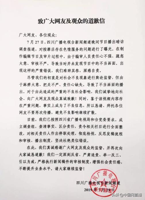 四川广播电视台官方微信公号发布《致致广大网友及观众的道歉信》,就此前“暗访”按摩店节目出现不当画面一事做出回应。信中称,在制作编辑节目及审片过程中,由于编审人员责任心不强、疏忽大意、审核不严,导致当时并未发现节目中的不当画面。已成立调查组,责令相关栏目进行全面整改,对相关责任人作出停职处理。恳请各位网友不要再次传播,避免不良影响继续扩散。