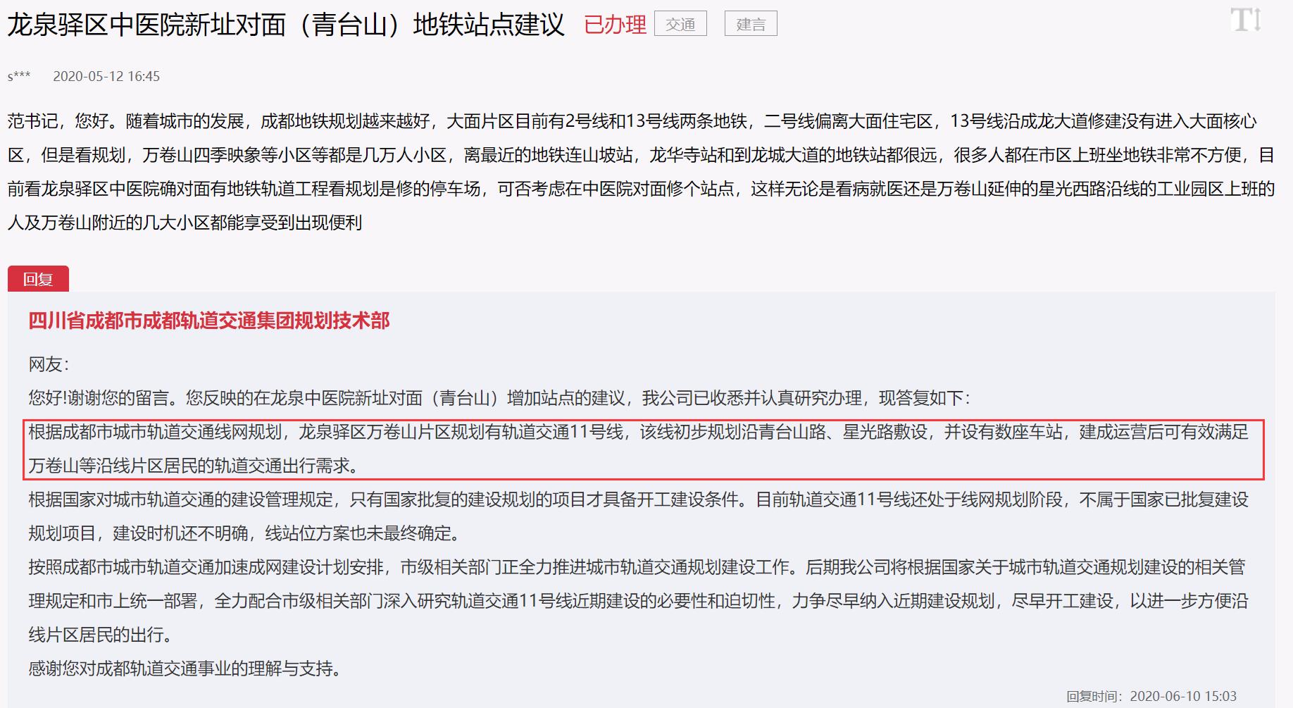 2、在人民网留到留言板块中,有网友在咨询万卷山附近的地铁规划,成都轨道交通官方对此回答如下:根据成都市城市轨道交通线网规划,龙泉驿区万卷山片区规划有轨道交通11号线,该线初步规划沿青台山路、星光路敷设,并设有数座车站,建成运营后可有效满足万卷山等沿线片区居民的轨道交通出行需求。