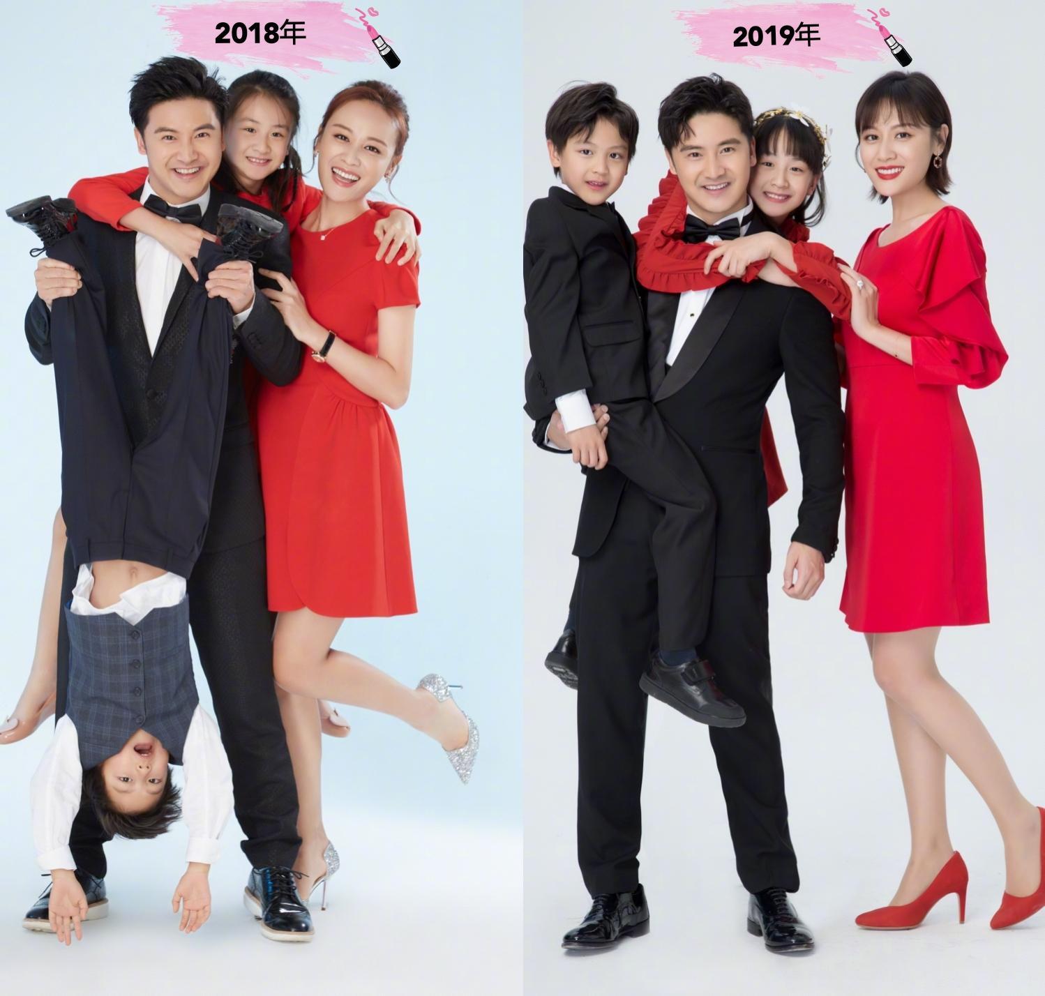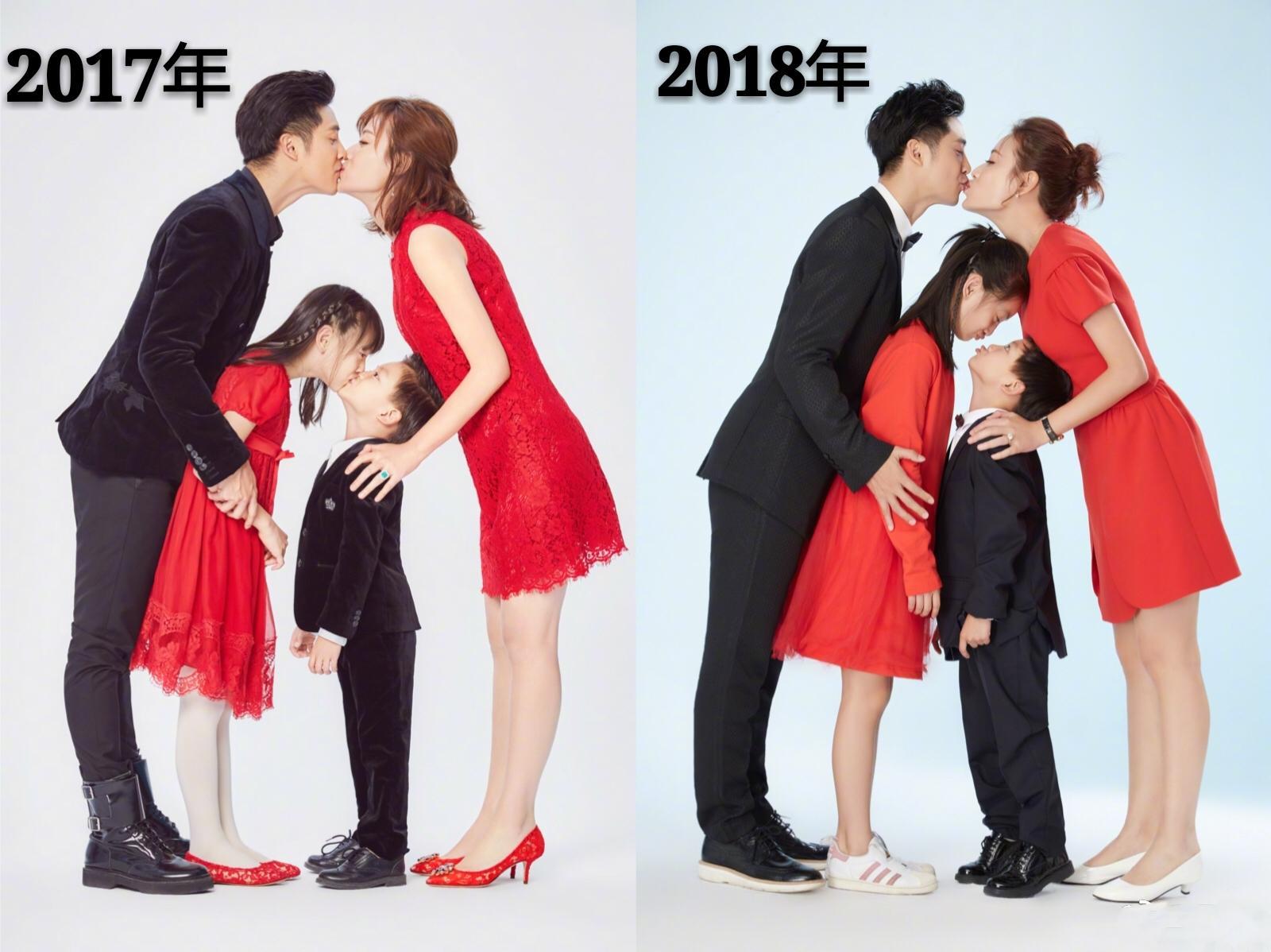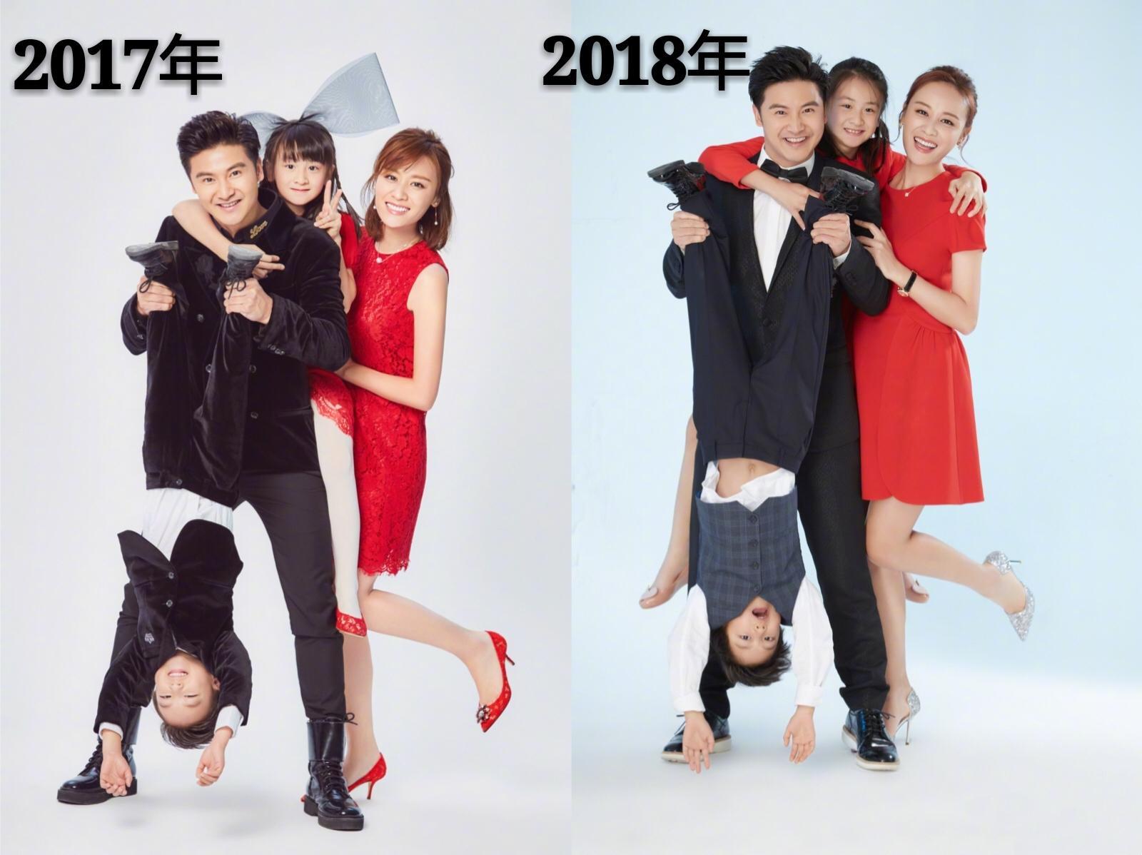 田亮叶一茜每年都会拍摄类似的全家福,曾经小亮仔还能被爸爸倒着拎起来,随着慢慢长高,就不能继续这么操作了。