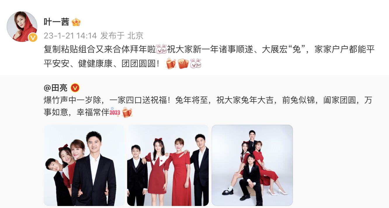 田亮为大家送上祝福,叶一茜转发称“复制粘贴组合给大家拜年”,同样送上温馨的吉祥话。
