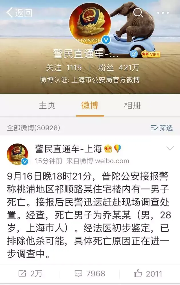 事情最开始是在下午6点有人报警称桃浦地区祁顺路某住宅楼内有一男子死亡,民警迅速赶赴现场调查处置。