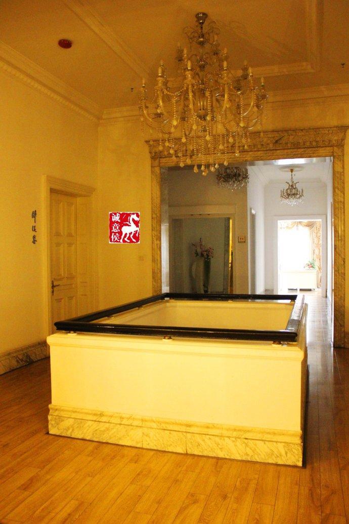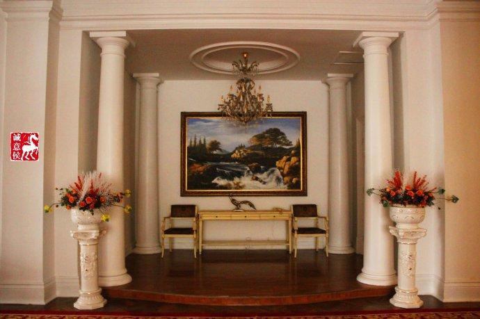一层流线的交点,有一间暗厅,墙上张贴西洋油画,四角支撑立柱,屋顶吊灯。