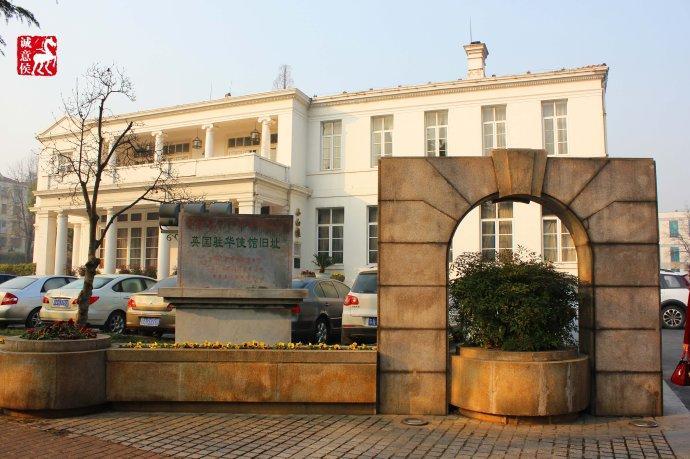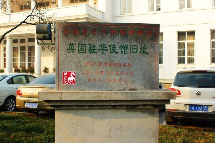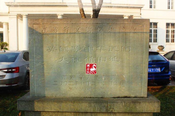 国保碑位于沿街入口,上刻:全国重点文物保护单位,英国驻华使馆旧址,中华人民共和国,二零一三年三月五日公布,南京市人民政府立。