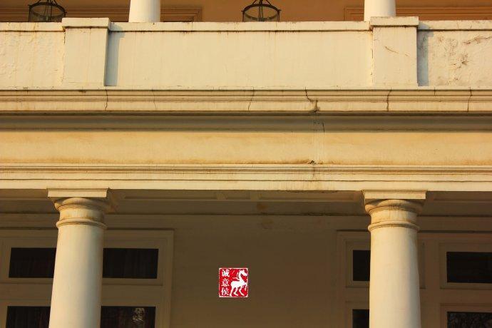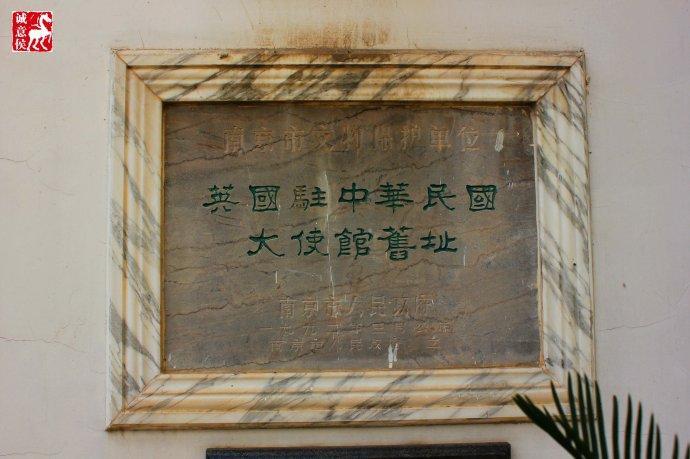 墙上嵌碑:南京市文物保护单位,英国驻中华民国大使馆旧址,南京市人民政府,一九九二年三月公布,南京市人民政府立。