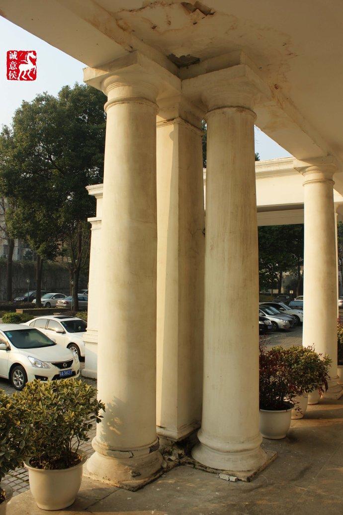 檐柱,上部收分形成梭柱,柱头与柱脚皆以多立克风格装饰。