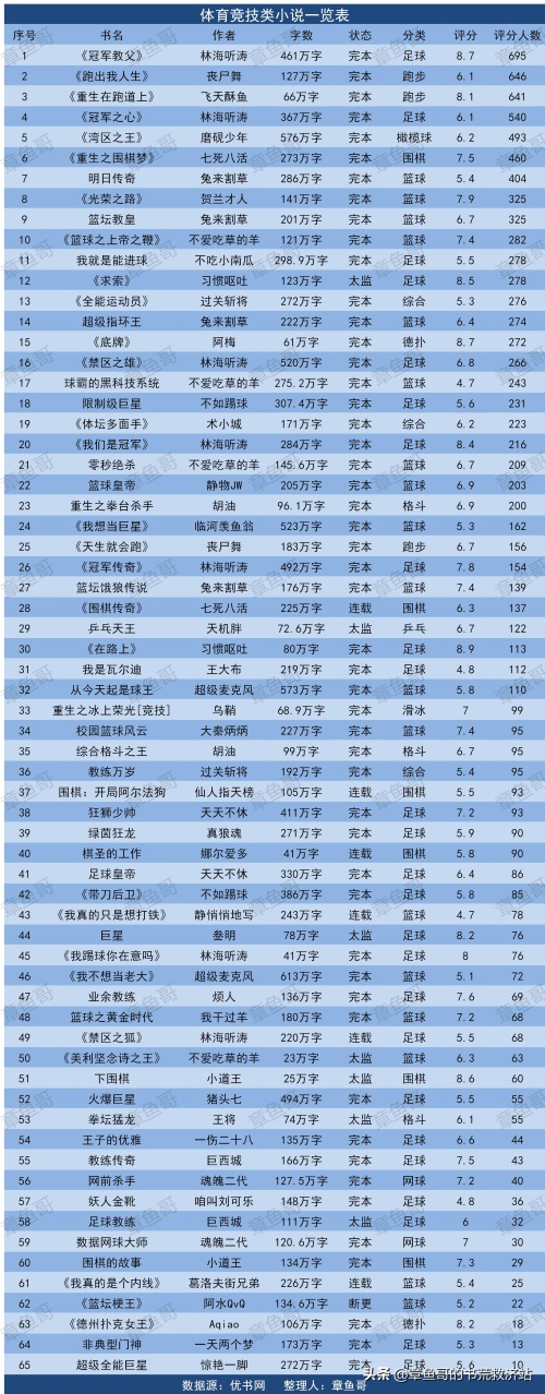 最后附上体育竞技类小说一览表,由于时间关系,表格里可能漏掉了一些优秀作品,大家可以在评论区补充和讨论。