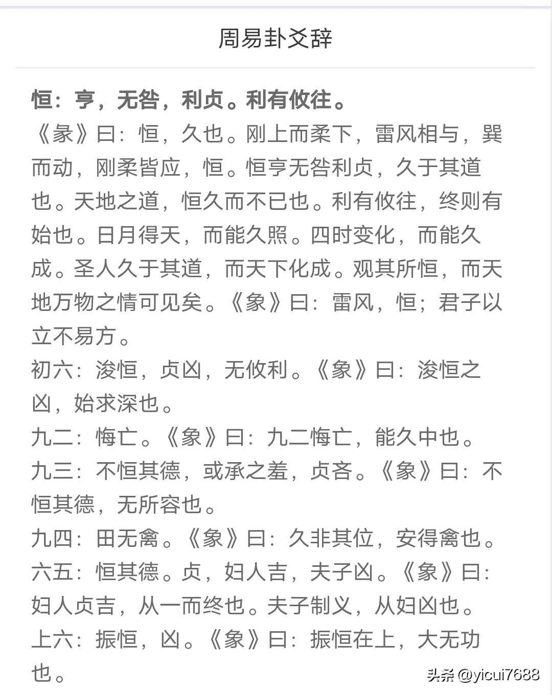 《彖传》说:恒卦,就是长久的意思。刚强者在上面而柔顺者在下面。雷与风互相配合,随顺而行动,刚强者和柔顺者能上下应和,这就是恒卦。恒卦通达,没有灾难,适合正固,是要长久走在自己的路上。天地的运行法则,是恒长久而不停止的。适宜有所前往,是因为终结之后需会有新的开始。日月依循天时,才能长久照明;四季变迁推移,才能长久形成;圣人长久保持自己的正道,才能教化成就天下人。观察这种恒久的现象,就可以看出天地万物的真实情况了。