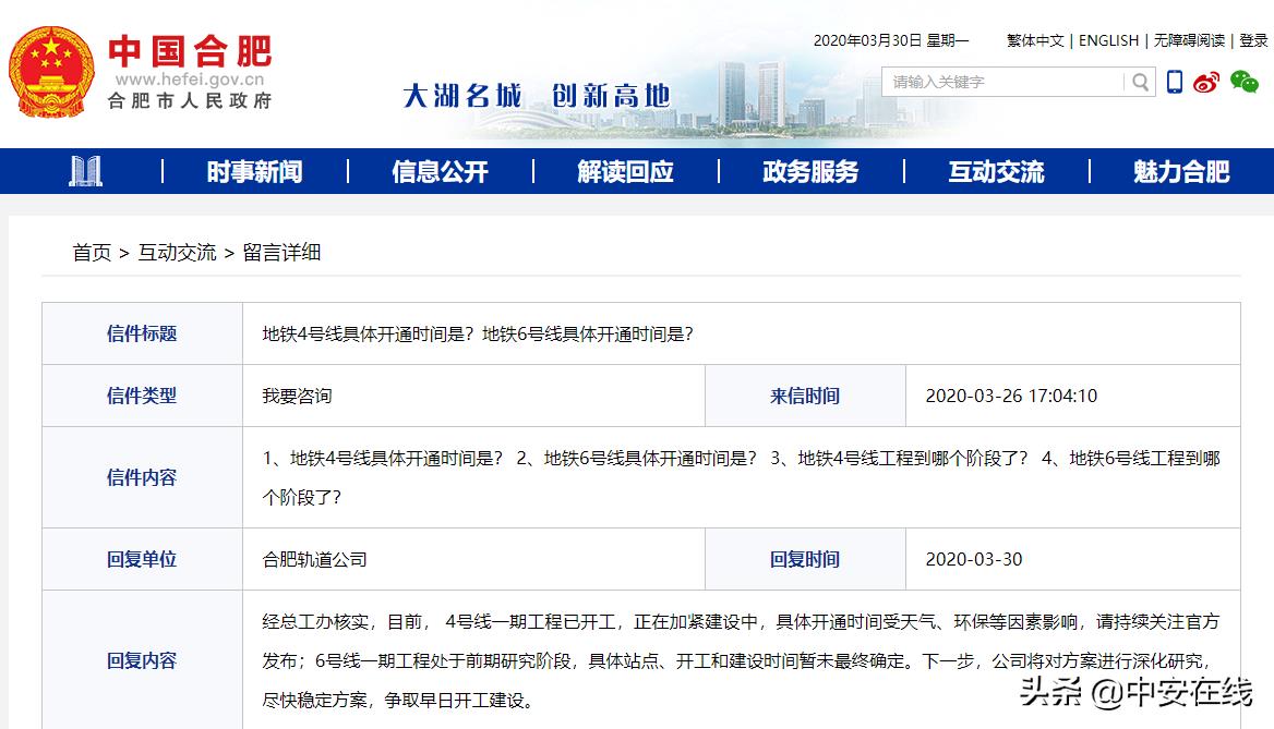 合肥地铁4号线、6号线什么时候开通?官方:4号线一期工程已开工