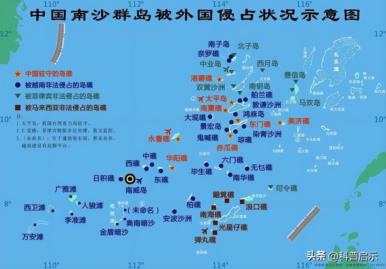 南沙群岛局势错综复杂,大量岛礁被周边国家非法占领,其中越南非法侵占29个岛礁,菲律宾非法侵占9个岛礁,马来西亚非法侵占5个岛礁,我国实际驻军8个岛礁(包括太平岛)。