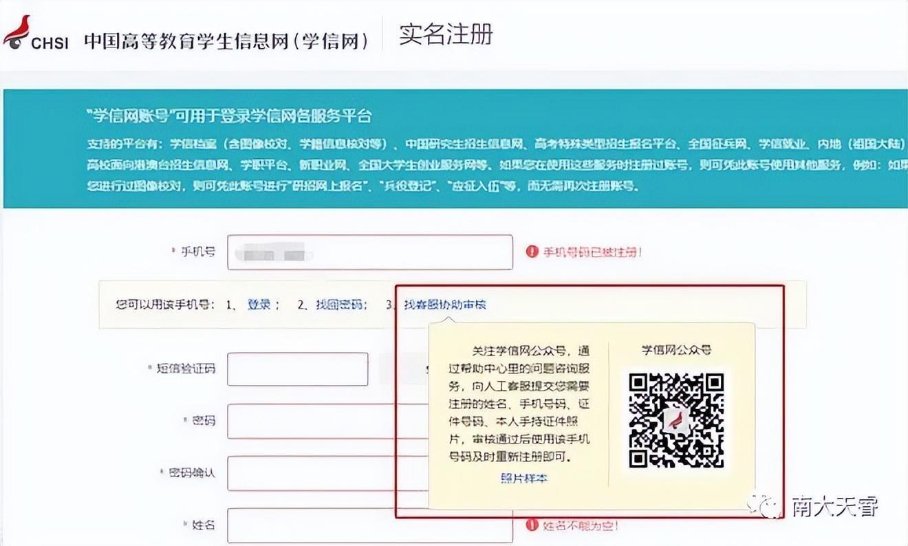 3.如果你的页面显示手机号已经被注册了,不要慌,按照提示去找客服就行了。注:重新注册不影响你查询学籍学历信息,用你的新账号进行登录就能正常查询。
