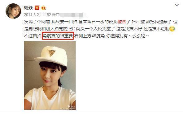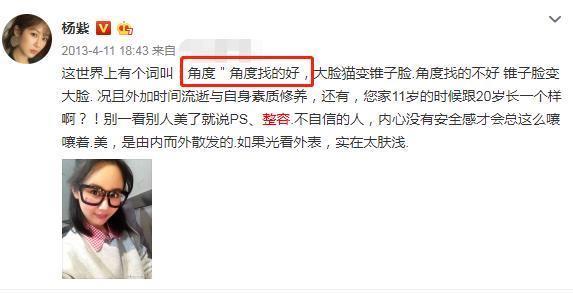 2014年,杨紫再一次提到"整容",表示自己和其他人合照时从没听过别人说她整了,但发自拍就会有人怀疑,并继续说照相角度是变化的理由。