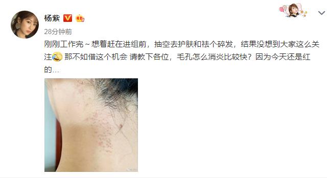 下午6点,杨紫亲自晒出一张脖子后面的照片,从照片上可以看到头发下方有密密麻麻的红点。
