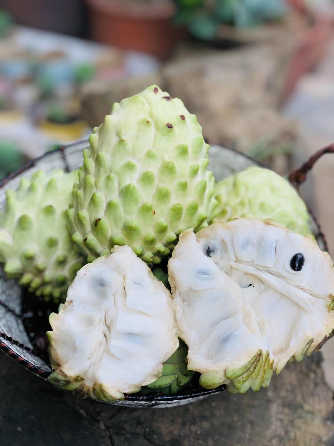 可能多数人买到之后,不知道怎么吃。它是属于“吃软不吃硬”的水果,生吃的话味如嚼蜡,而且肉质很硬的。成熟后的释迦果,手感变软,果品绿色转淡、带黑褐色斑块,这时候吃,甜得像奶油或者冰淇淋一样。