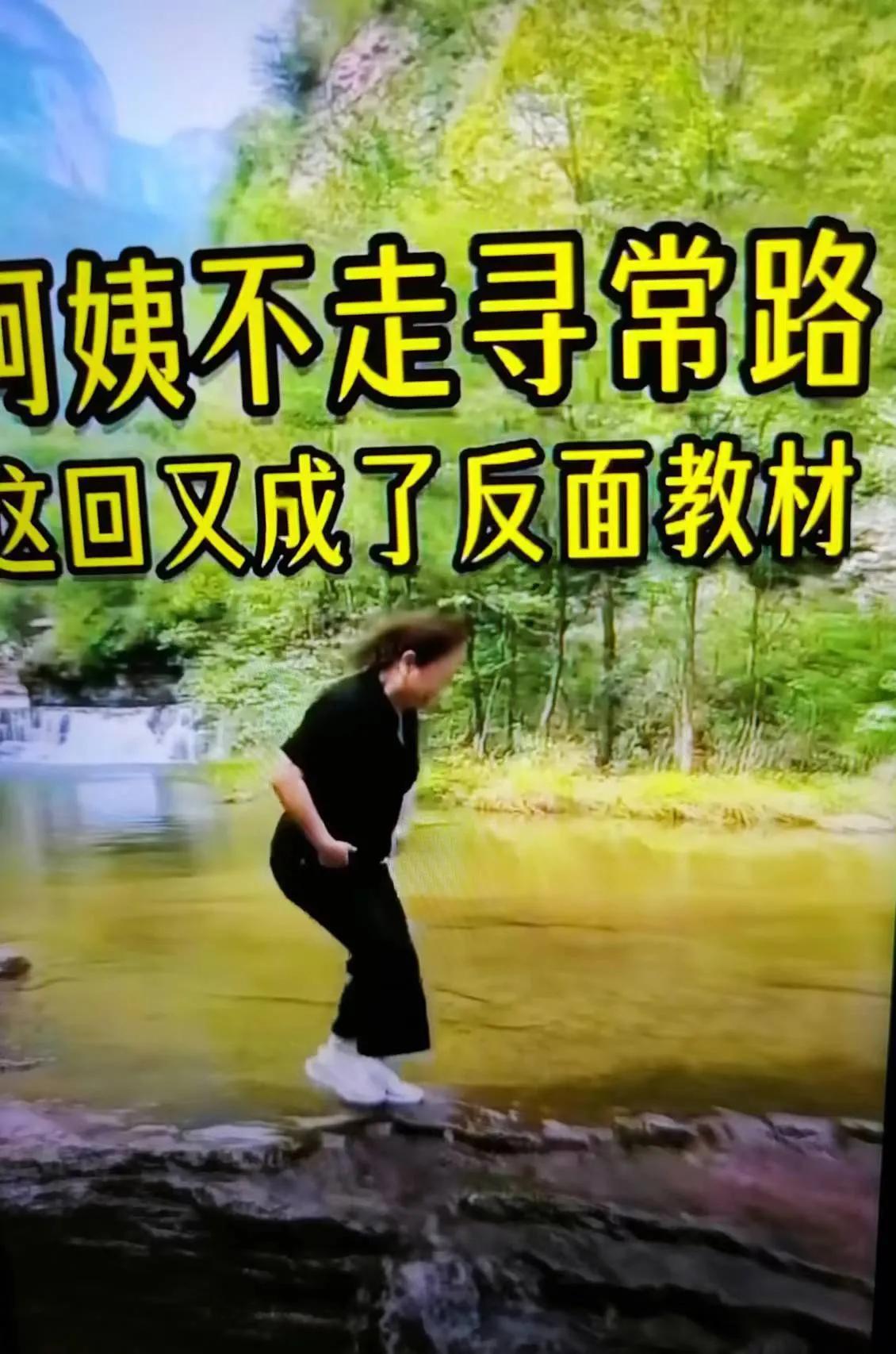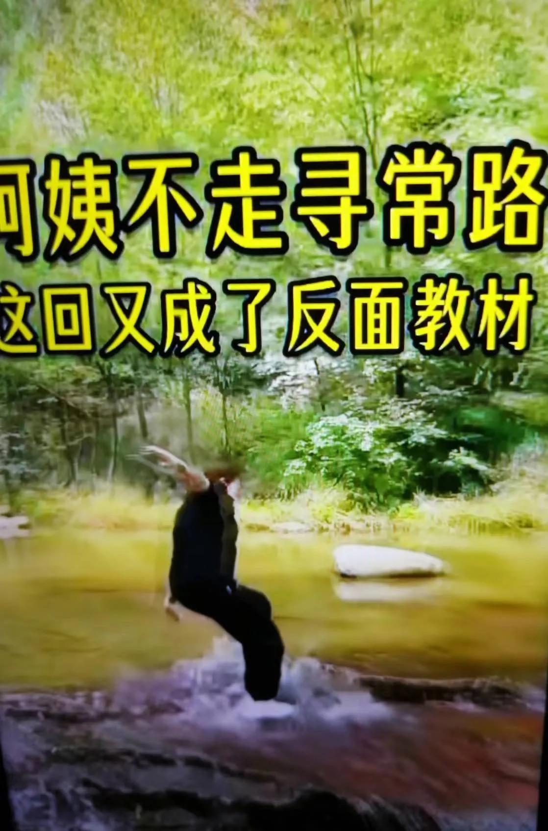 这位大妈妈,不走寻常路。非要下河试试水深水浅,出个风头。秋伏天里,进山沟沟河边边玩耍是最好的,凉爽,山青水秀,鸟语花香。大姐姐是想过河那边去,但她忘了一个基本常识,河石板上久无人走动,石板上有青泥苔,打滑。而且又是一个河坎,下面一个大水塘,她才踏进第一步,哈哈,一个优美的姿势,脚下打滑重重的摔倒,滚下大水糖。万幸,一路人多,老公边骂边跳进水塘,抱起大妈妈,因为水塘只有齐腰深。这一跤把大妈妈摔得不轻,住了半年医院。