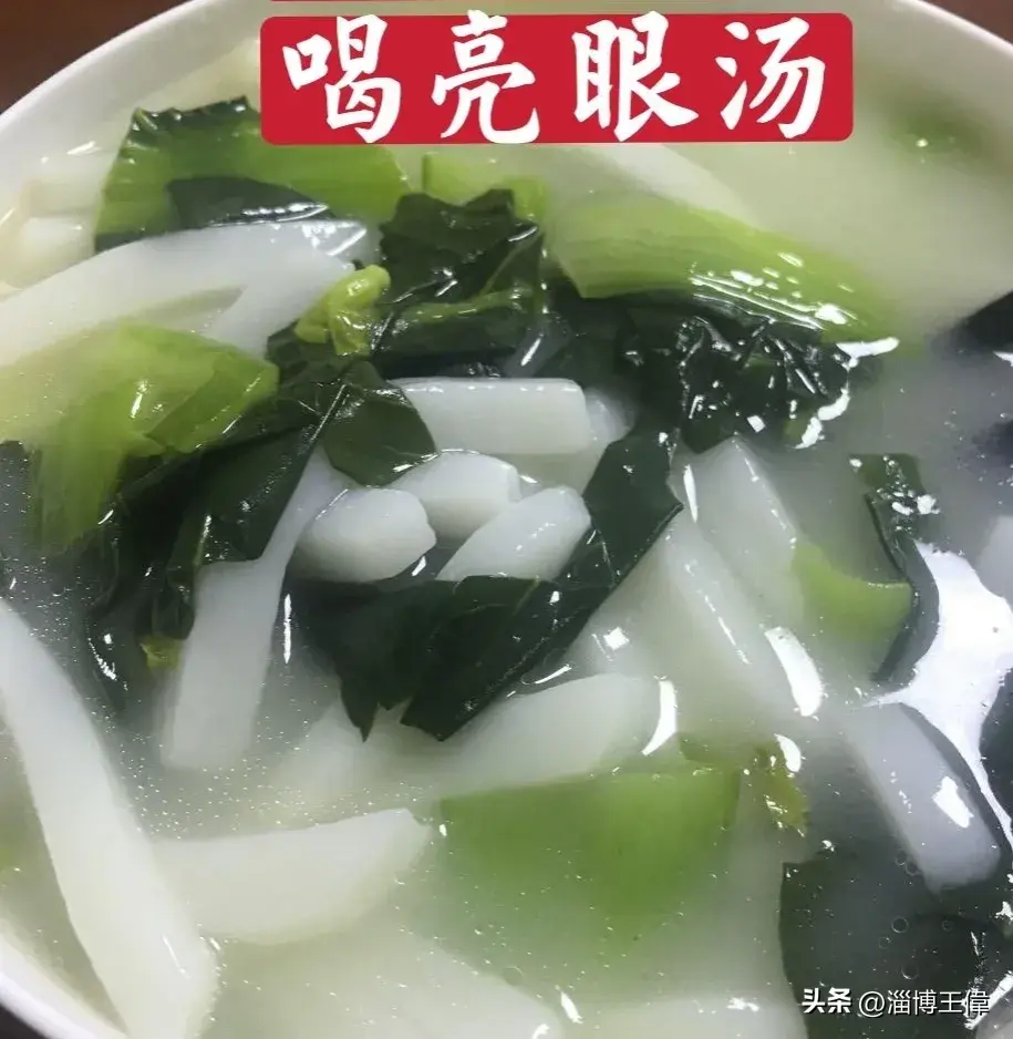 亮眼汤其实就是碗青菜麻糍汤。做法一般为将麻糍切成小手指般大小的一条条,然后将洗净的青菜合二为一,下锅煮熟,放入适量的食盐、酱油,挑上一撮熬熟的猪油,就成了民间传统的食材,一般是早上就起来喝了。要注意的是在煮的过程中,若用淀粉勾芡一开始不能量太多,看着羹太薄,可以试着不够再加淀粉,不然实在太稠羹汤不好吃,又补救不来。汤盛好后,可以依自己口味加减,比如放点葫萝卜碎、香肠碎、花生碎等都是很好吃的,特别是有些小朋友不爱喝蔬菜汤的,可以用此法增加味道。