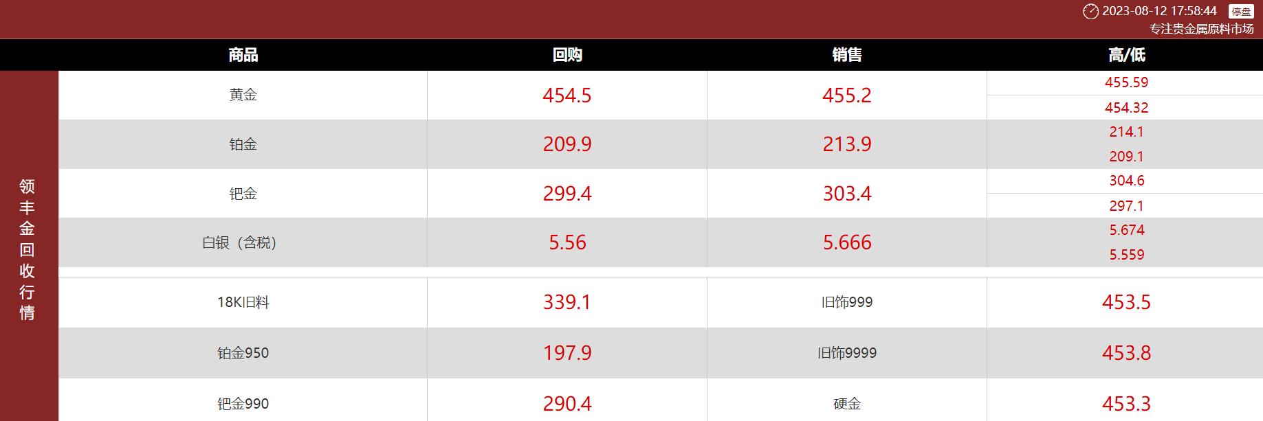 首先,我们要了解黄金和铂金的市场情况。近期,黄金价格一路飙升,引起了广泛的关注。截至 2023 年8月12日,黄金价格已经突破了每克455元的大关。相反,铂金的价格则相对稳定,甚至有所下滑,铂金价格在每克198元左右。