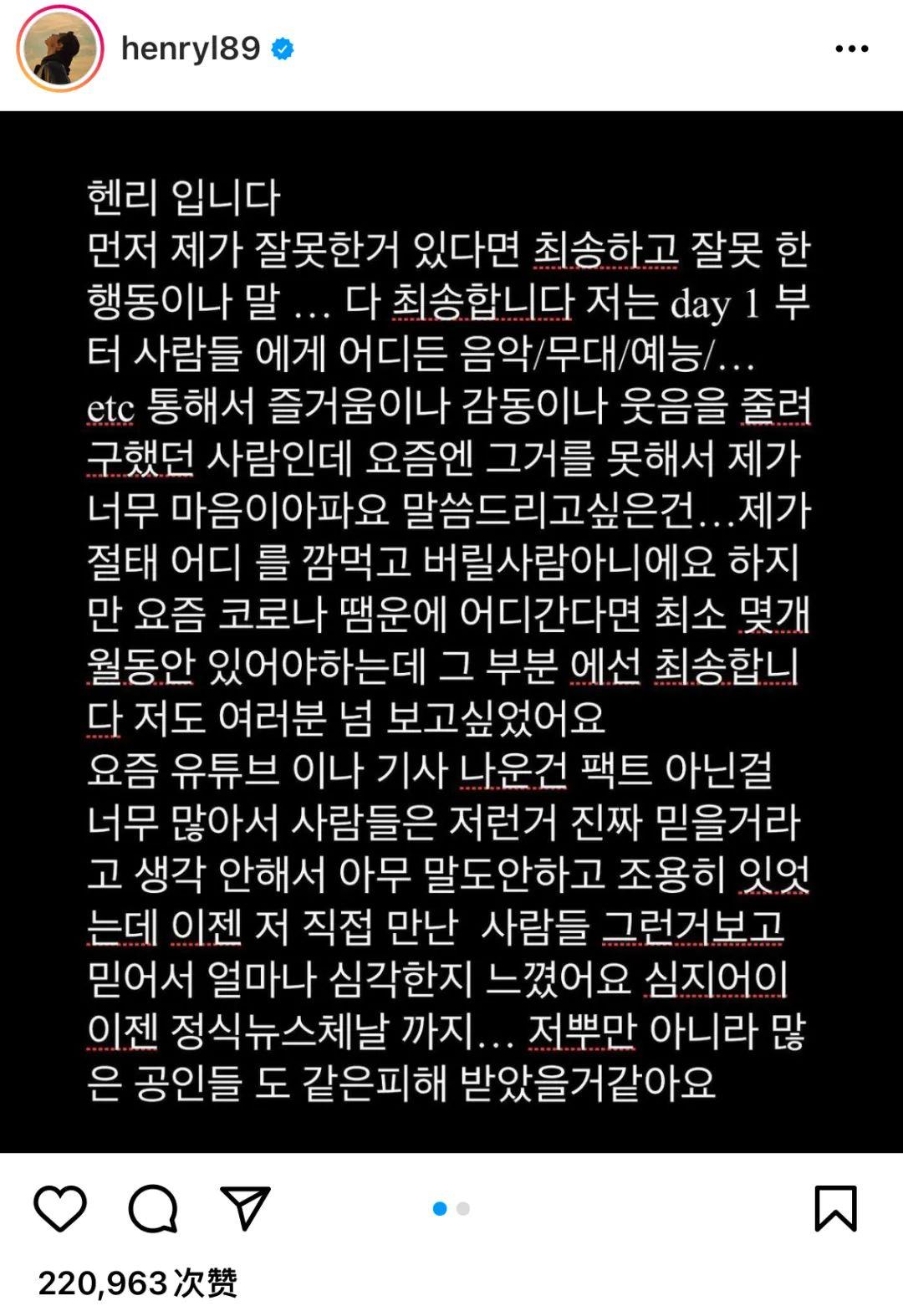 而最终点燃韩国网民怒火的是北京冬奥会期间,韩媒称Henry删除了自己Youtube频道下贬低中国的留言,却对贬低韩国的留言置之不理。对此刘宪华在个人ins发了声明并且道歉:如果自己的行为有错,那么他愿意道歉。然后他向粉丝致歉,因为最近没能给他们带来欢乐。随后他表示,最近的争议并不是他言行有失导致的,而是因为他的华裔出身。文章最后,他再次进行了道歉。
