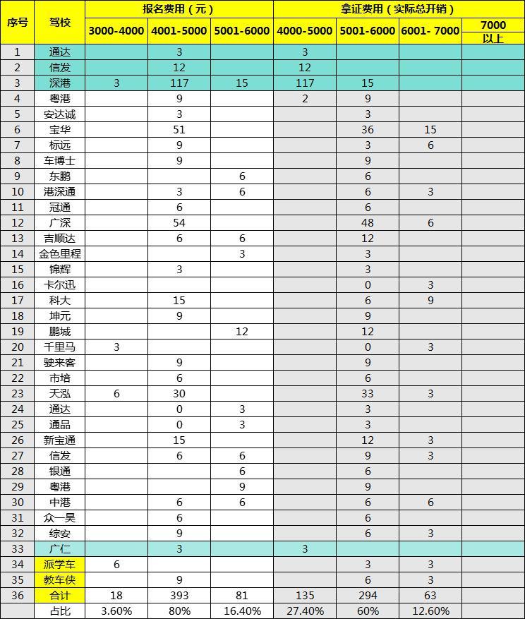 因此,根据这个市场调查,单从报名费和实际开销费用来看,可以发现深圳市宝藏驾校为深港驾校、通达驾校、信发驾校、广仁驾校,真正做到货真价实、一费到底、良心驾校。但从另外的角度来看,绝大部分驾校考取驾照费用在5000-6000之间,也说明一个问题,深圳各方面成本很高,再怎么低的学费,最终也要花到5000多元,做生意无利不起早,没有人会做亏本生意。只不过规范的驾校4000多报名费,明码标价,薄利多销,而挂靠教练为了招生,低价报名,后续有很多变相收费,每月招五六人,每人不多收一两千元,根本无法生存。如此说来,也不难理解驾培市场价格混乱了。