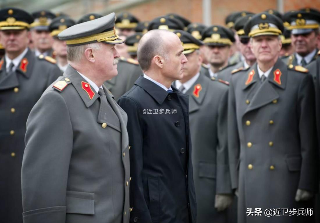 另外还有一些国家,比如奥地利军队,采用不同颜色区分不同的兵种,有些兵种,比如军医、技术、军校、通信、炮兵/防空、仪仗都是红色系,尤其是仪仗部队,一般佩戴红领章出镜,比如下图所示。
