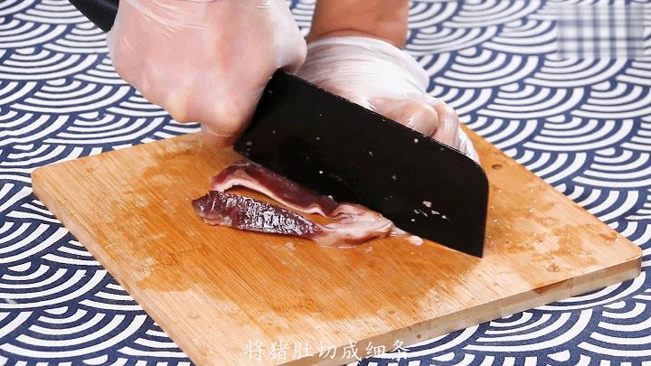 猪肚买回来用流动水搓洗干净,放入碗中,用盐或白醋分两次搓洗猪肚,并用水冲洗干净,最后加入淀粉搓洗,再用水冲洗干净,这样猪肚就没有异味了,把煮好的猪肚,放入高压锅压8分钟,捞出切成长方形的备用。