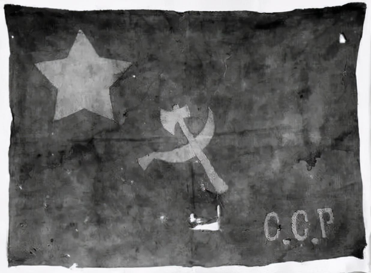 在旗帜的中间绣着不规则的镰刀和斧头标志。右下角有代表中国共产党的英文名称缩写CCP。这面旗帜就是目前在山东省发现的最早的党旗,没有多少人能够知道,在中华民族解放战争史上,这面已经被珍藏80多年之久的党旗,经历了抗日战争和解放战争两个艰苦卓绝的时期。