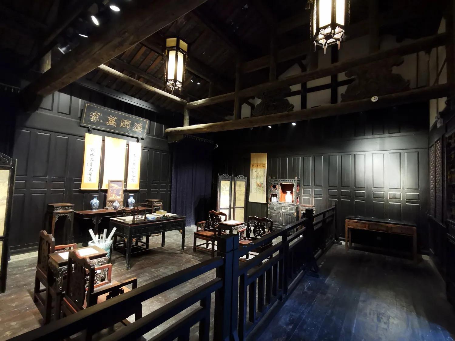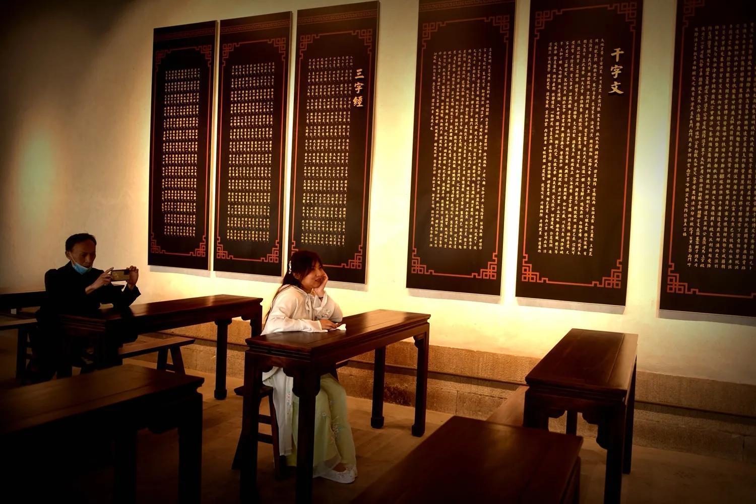 走进设有书桌的长条型教室。蒲老师说,这间教室原来是两间教室,中间有道隔墙,自己就在其中一间教了两年学生。现在这间教室,已改为清代私塾陈设,以此表明会龙庄主人为耕读世家。