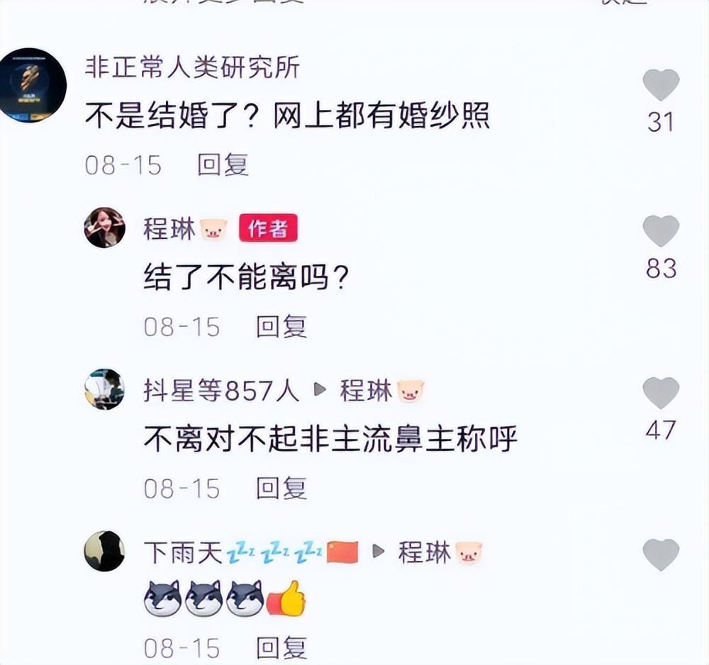 但是很快一个令人震惊的消息再次令无数网友震惊,面对网友不是结婚了吗的询问,程琳也没有藏着捏着,而是直接回应结了不能离吗?也是印证了目前已经离婚的结果。