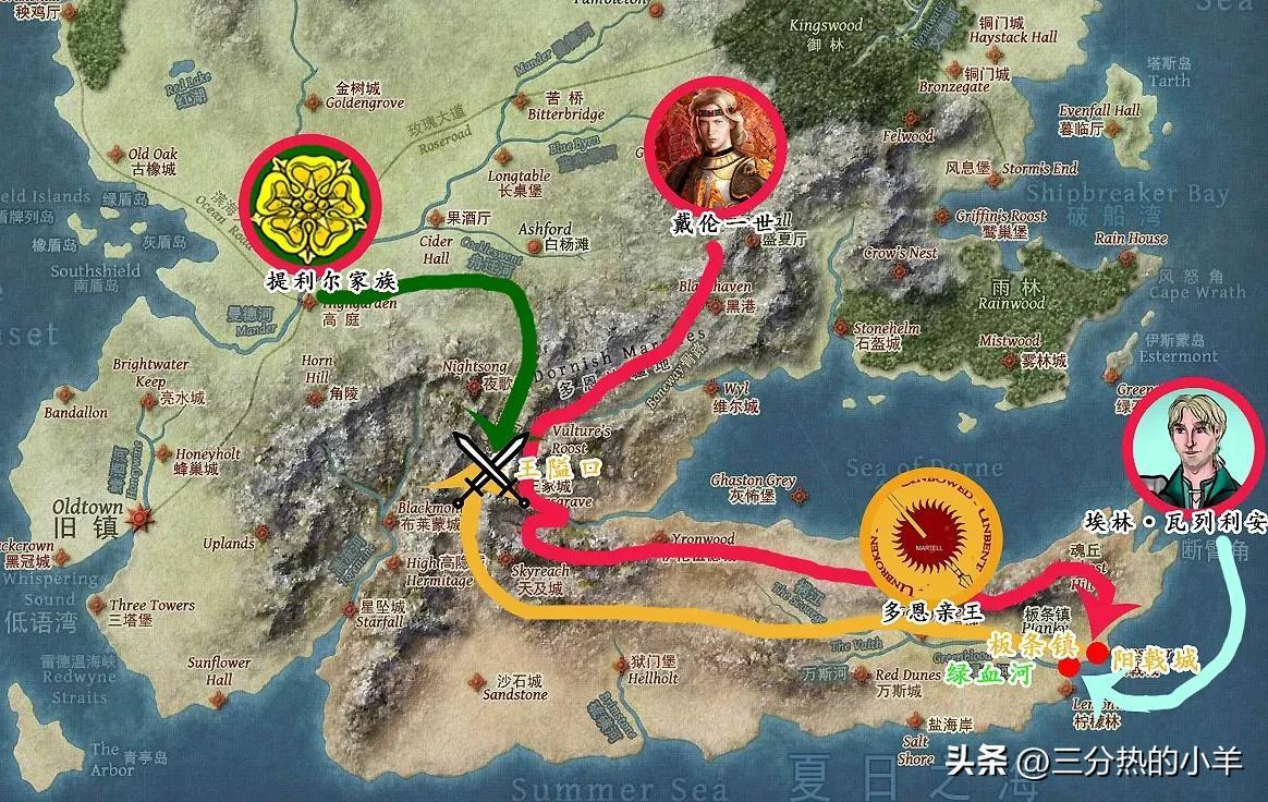 兵分三路:莱昂诺·提利尔进攻亲王隘口;戴伦绕过骨道秘密长驱直入多恩腹地;埃林·瓦列利安从海上进攻板条镇