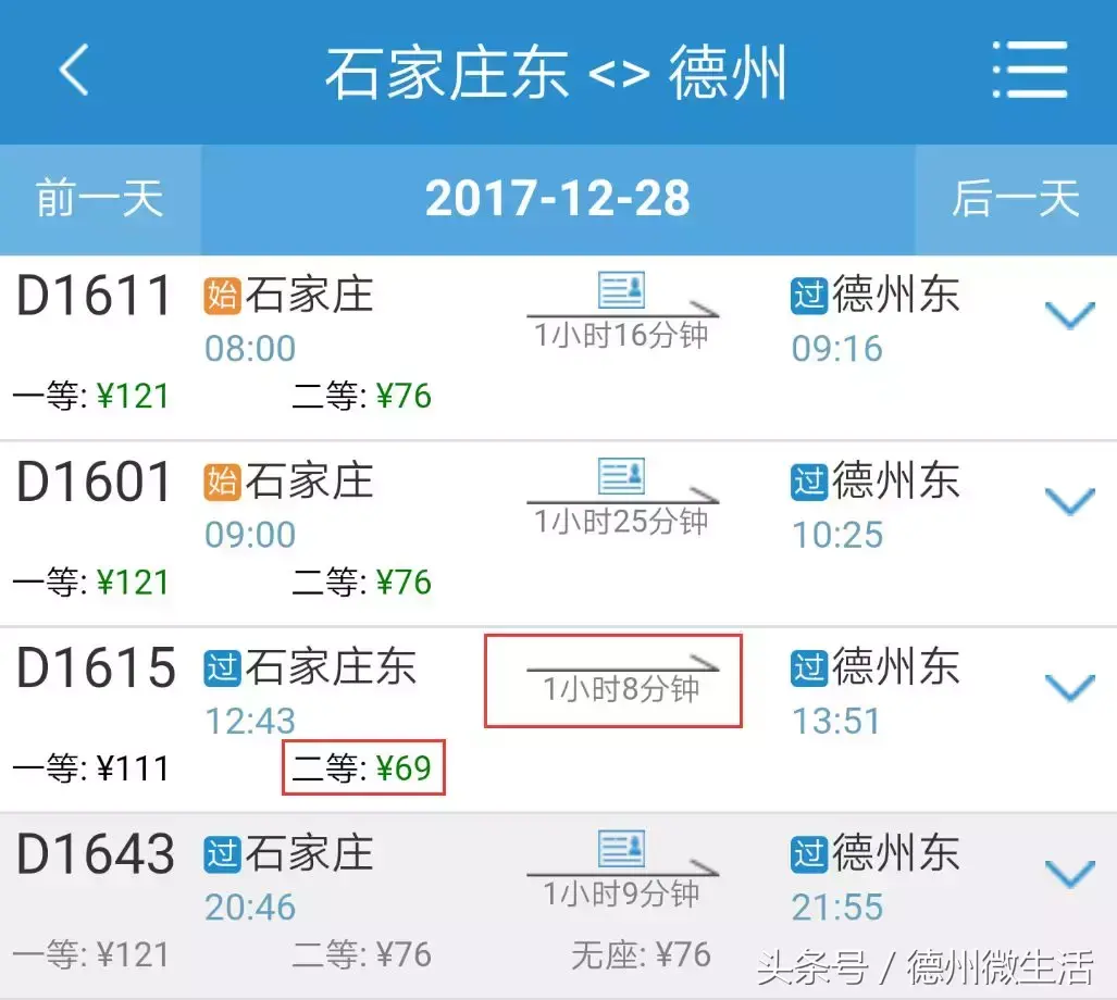 记者查询12306看到,D1615德州东至禹城东,仅需23分钟车票16元,之前坐普通列车,德州到禹城需要40余分钟。 D1636德州东至石家庄仅需1小时20分钟,比之前节省80分钟,车票仅需76元。