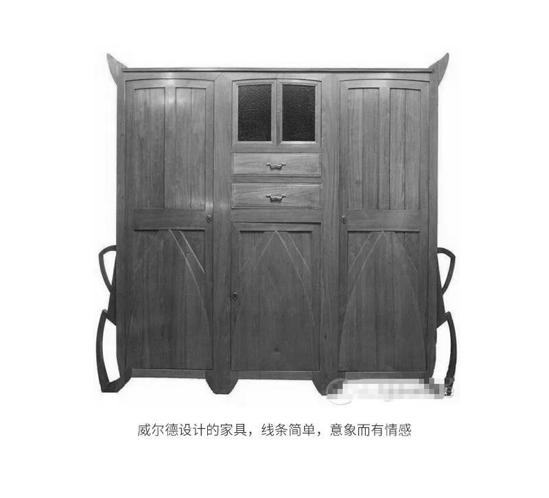 而此前其实他已经不务正业的涉足了诸多设计工作,在其25岁时候就因为技能过硬,见识独到,思想领先,广结善缘等优点被当时一众设计师推举为比利时版“新艺术运动”的带头大哥,他最初从建筑设计开始,带领著名的“二十人小组”引领其它比利时艺术家及设计师从纯艺术向实用美术和设计转化,婚后的威尔德以设计家具为主进行新艺术形式的探索,比方1897年设计的紫檀木柜: