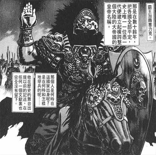 霸王加尔赛力克对待敌人毫不留情,他在战斗的时候经常佩戴骷髅状的恐怖头盔,这也使他拥有了“骷髅皇帝”的名号。