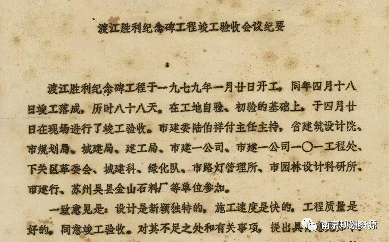 我局城建档案馆馆藏档案:渡江胜利纪念碑工程竣工验收会议纪要