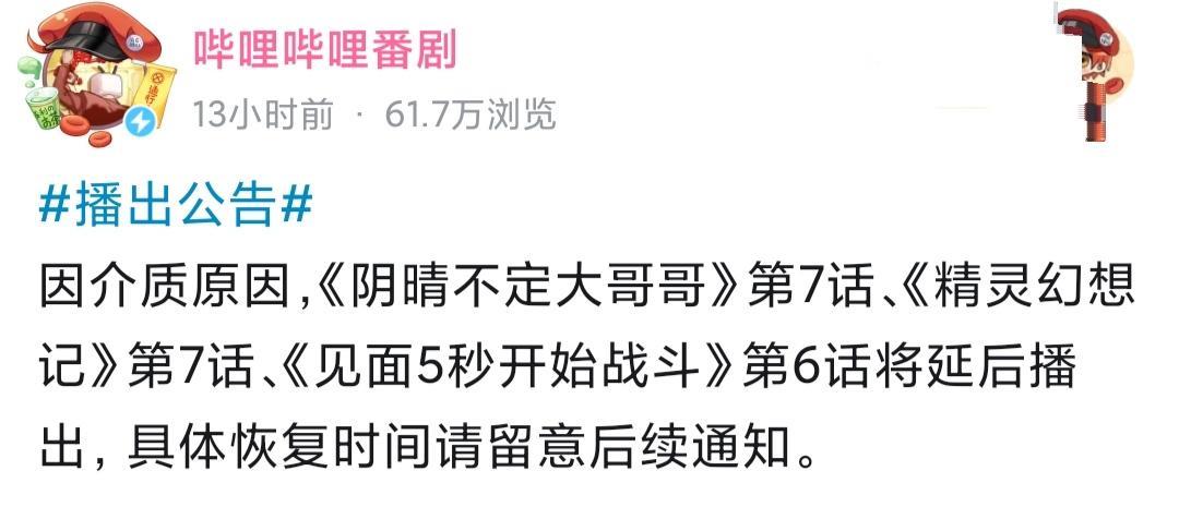 在8月16日官方就提前发布过声明,表示《精灵幻想记》第七话,《阴晴不定大哥哥》第七话以及《见面5秒开始战斗》第六话这三部作品同样因为“介质原因”宣布延播。