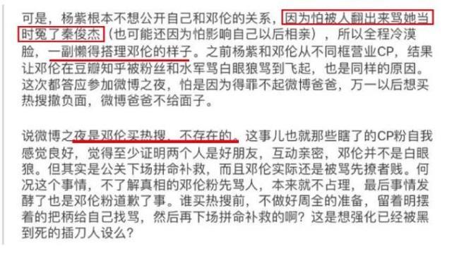 爆料人表示在微博之夜那天,邓伦秀恩爱就是为了接下来的公开做铺垫,还因为获得了跟杨紫同框的机会,激动不已,但是杨紫却一点不想公开恋情,全程异常的冷漠。