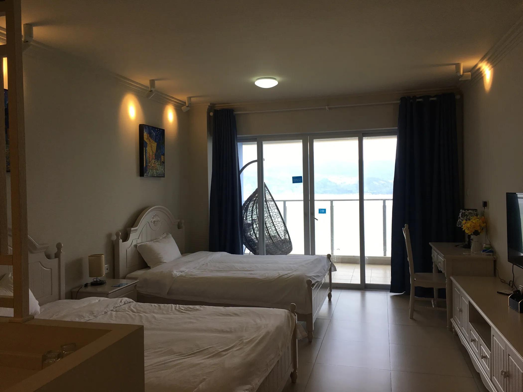 这间融创海湾半岛公寓在惠州稔山镇莱蒙水榭湾,公寓还带私家海滩,游客稀少。房间露台面向大海,每天260元,约40平方米房,1.5米的双床,不包早餐,每个房间都有大阳台,吊篮椅子,洗衣机。酒店只有一个泳池,无边泳池不大,要另收费,每人20元。
