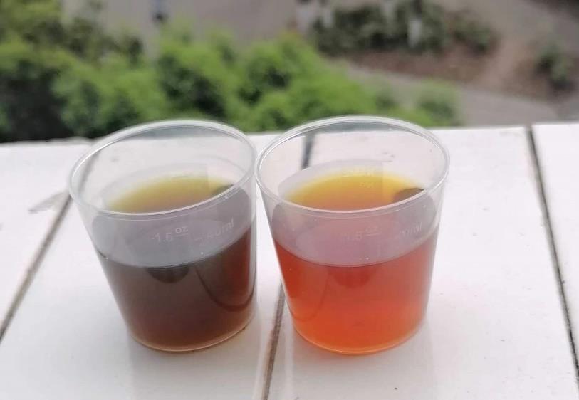 图2. 尿卟胆原日晒检测样品,左侧为阳光暴晒后的呈深棕的尿液,右侧为初始尿液