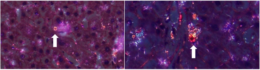 肝脏穿刺活检标本病例检查结果:扩张的毛细胆管及活化的库普弗细胞胞浆内可见“胆栓”,在偏振光下呈Maltese 十字(图1)。