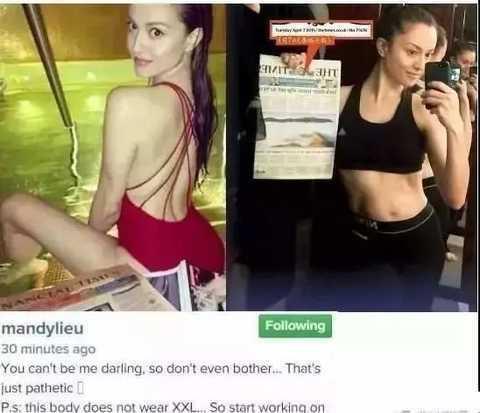 当时刘碧丽在社交平台上晒出了一张性感泳衣照,并意有所指地称“我可不穿xxl码”