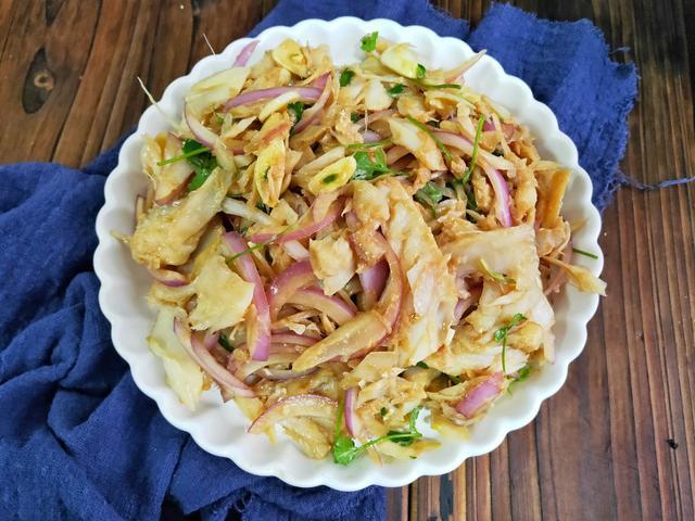 材料:海兔子鱼干,圆葱,大蒜,醋,生抽,盐,蚝油,香油,香菜