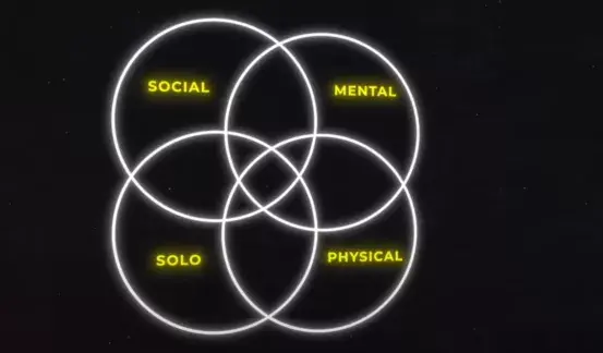 然而,找到一些有趣的爱好可以帮助你。哲学家维克多·弗兰克尔曾说过,生命的意义在于始终有一个目标,有一些事情要做,有一些激情。所以,我认为有四类爱好,你应该在每个类别中找到一个爱好。为了向你说明这一点,我的编辑想出了一个花哨的维恩图,左边是你和别人一起做的爱好和你独自做的爱好。另外两个类别是精神爱好和身体爱好,这相当不言自明。