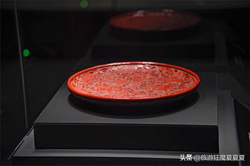 里面藏品之丰富,非一两个小时就能穷尽,而且分门别类各有经典,比如在漆器上,就有剔红荷塘双鸳大盘,虽然它的年代并不算久远,左边针刻竖排单行“大明永乐年制”款,但是却异常精美,盘中雕刻荷塘里两只鸳鸟图案,其中一只引颈上望,另一只则展翅俯冲,互相呼应,栩栩如生,也是省博官网展示的藏品之一。