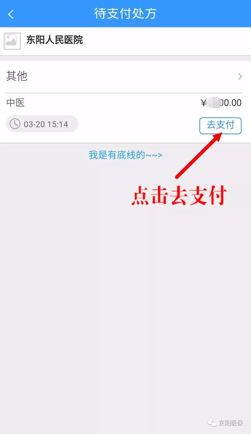 医生开完处方后或化验检查单位后,医院系统按参保人员本次就诊医疗费用向东阳人社APP发送支付订单位信息,参保人可通过“就诊缴费”模块查看“待支付处方”、点击立即支付,输入支付密码完成缴费,支付成功后显示处方单及结算明细。