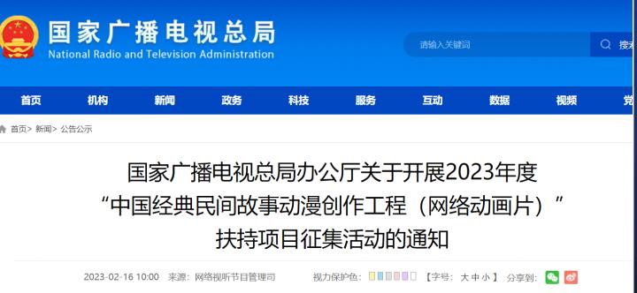 2月15日,国家广播电视总局办公厅发布了关于开展2023年度“中国经典民间故事动漫创作工程(网络动画片)”扶持项目征集活动的通知。该活动面向各互联网视听节目服务单位、广播电视节目制作经营机构、各行业影视节目制作机构、各影视传媒类大专院校(院系)等创作者,征集中国经典民间故事网络动画片创意与原创剧本。