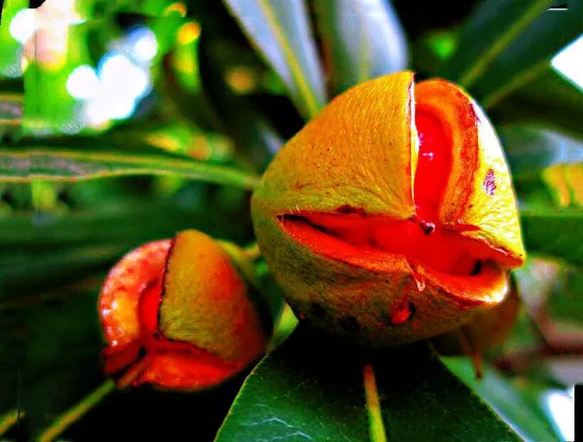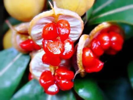 花期3-5月,果熟期9-10月,入秋后果实开裂露出红色种子,颇为美观。