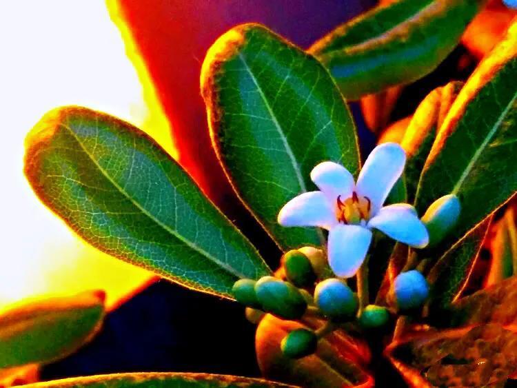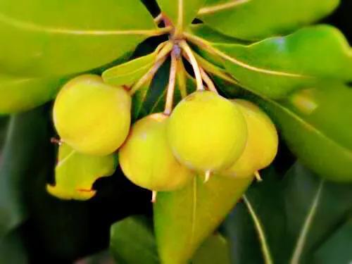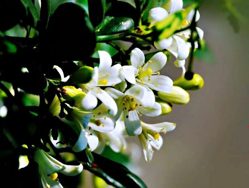 海桐,叶聚生于枝顶,二年生,革质,簇生,光洁浓密,耐修剪,易造型。 伞形花序或伞房状花序顶生,花白色后变黄色,有芳香。蒴果圆球形,裂后露红色种子。