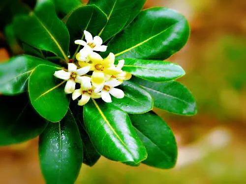 海桐,株形圆整,四季常青,花味芳香,种子红艳,为著名观叶、观果植物。