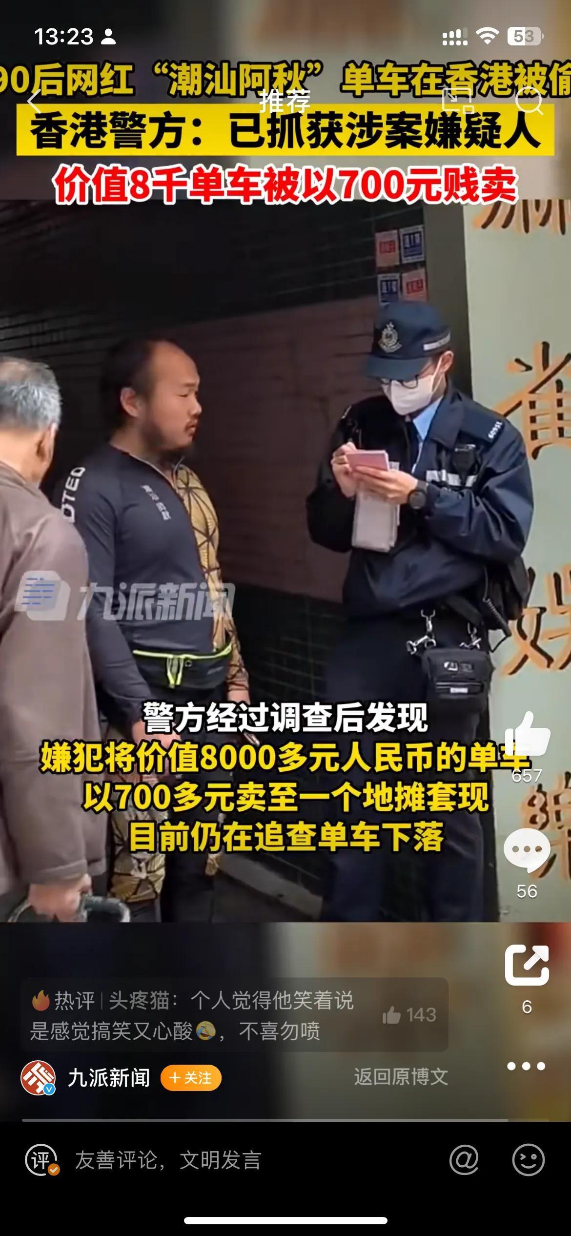 今日一则新闻上了热搜“网红阿秋的单车在香港被偷”