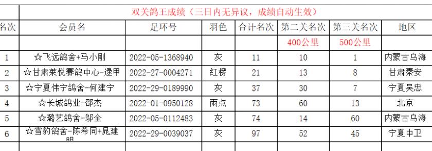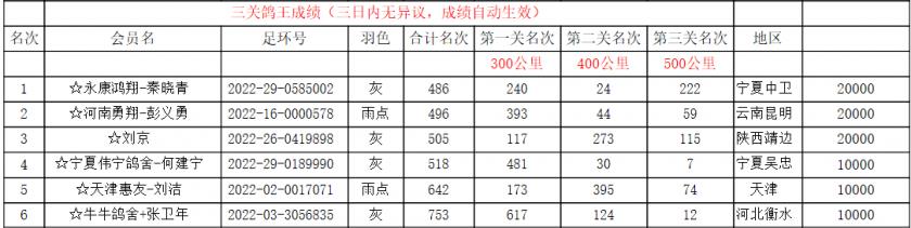 赛事大幕将落,三关鸽王揭晓,本届赛事宁夏中卫鸽有永康鸿翔-秦晓青的一羽灰鸽关关都有不俗表现, 足环号2022-29-0585002。该羽赛鸽以首关240名,二关24名,第三关222名的优异成绩斩获三关鸽王王座。