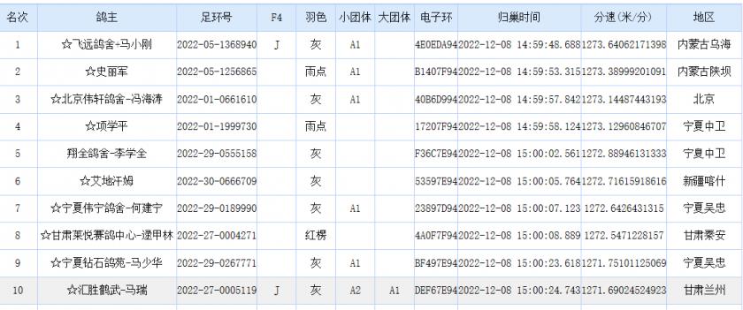 本关亚军则来自史丽军足环号为2022051256865的参赛鸽,归巢时间当日14点59分53秒,分速1273.390米/分本关季军则由北京伟轩鸽舍-冯海涛足环号为2022010661610的一羽灰鸽所斩获,归巢时间14点59分57秒。本关前十在一分钟内全部取满,分速均在1270米/分之上。本关前百在三分钟内尽数取满,足见本关竞争之激烈,决赛关赛将各个实力卓越。