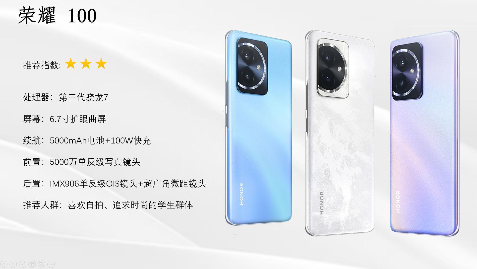 荣耀 100首发搭载了第三代骁龙7,就是一款定位中端的芯片,但是注意这款芯片并不是前几个月的神U骁龙7+G2的迭代,而是骁龙7G2的迭代。作为一款定位拍照的产品,搭载的这款芯片只能说是常规配置,没有什么亮眼之处,日常使用是足够了,但是游戏的话还是有些吃力的。